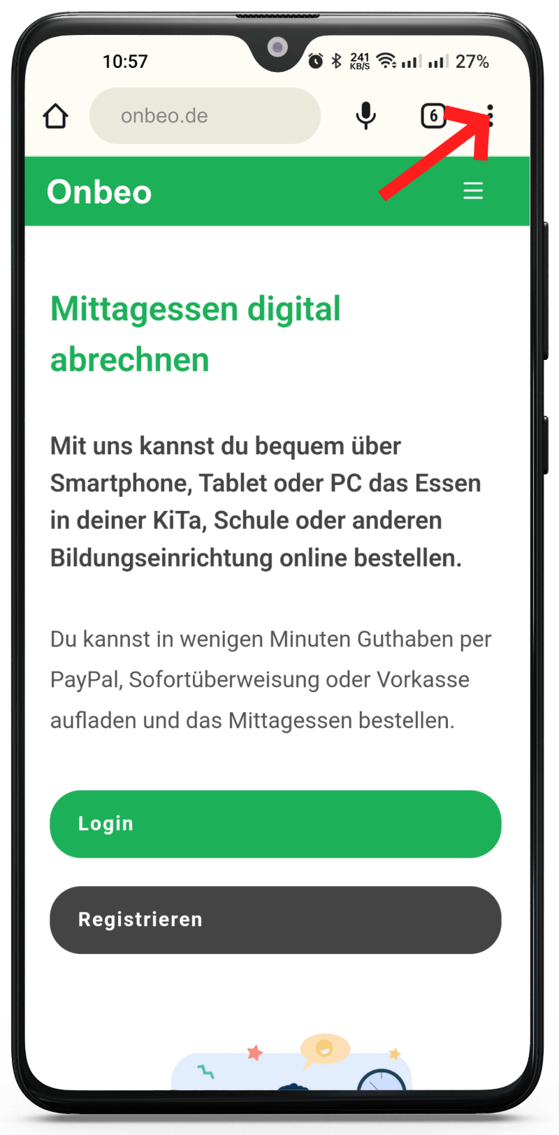1)Tippen Sie beim Ansehen der Onmensa Website auf die drei Punkte in der Menüleiste.